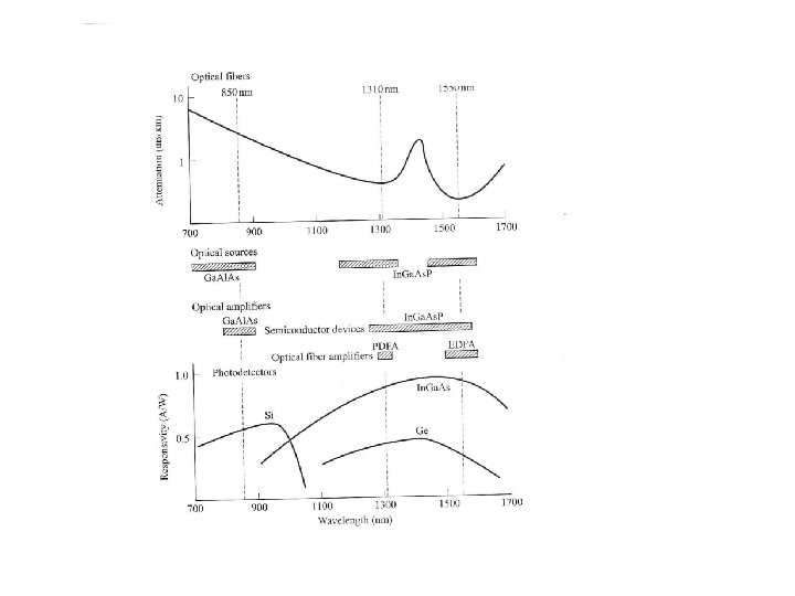 The Evolution of Fiber Optic Systems • First generation operated around 850 nm. Bit rate 45 -140 Mb/s. Ga. As-based optical souces, multimode fibers and silicon detectors. • Second generation at 1300 nm. Substantial increase in transmission distance and bit rate (622 Mb/s-2. 5 Gb/s). Both multimode and single mode fibers were used.