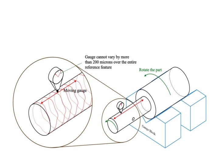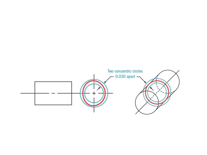 GD&T Tolerance Zone: • Two concentric cylinders that run the entire length of the feature – one inner and one outer, in which all the points on the entire surface of the cylindrical feature must fall into. The entire length of the called out feature would be controlled.
