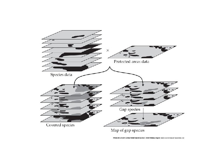 When decisions have been made about what species to protect, how do you determine what areas to protect? The procedure is called gap analysis. 1. Identify on separate maps the distribution of the species and those areas already under protection. 2. Overlay those maps to determine which species are present in already protected areas (and with sufficient representation), and which are not. 3. Those not represented are called gap species. Overlay maps of gap species distributions to identify where new protected areas are needed.