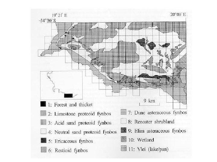 2. Select a 2 nd fragment in each habitat type which adds the most new species. If no fragments of some habitat type add new species, skip any further additions of that habitat type. If all species are included, then stop. 3. Continue selecting additional fragments in each habitat type not yet fully represented using the criterion of rule 2 until all species are included. It is this approach that was used to protect fynbos in the Cape Floristic Province. Grid lines divide the region into 3 km by 3 km squares, and species lists were developed for each square.
