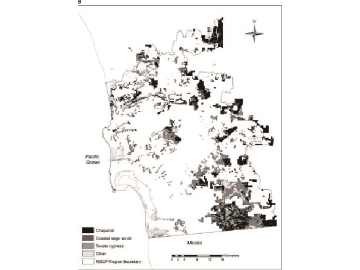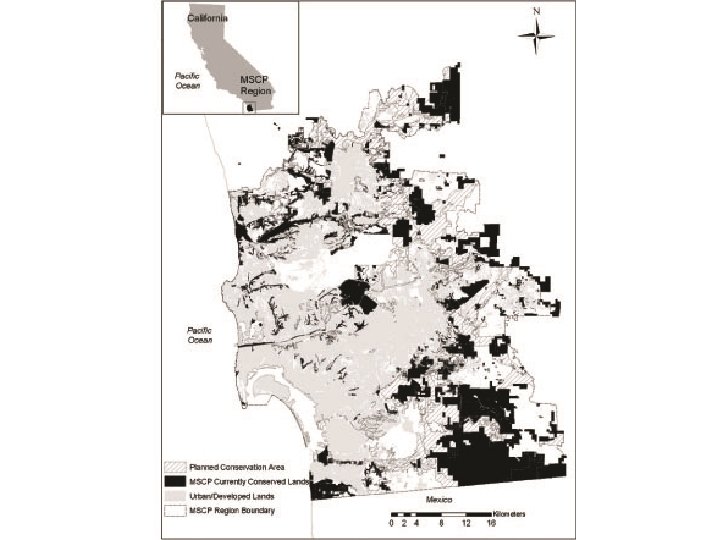 Modern conservation strategies try to use communities, instead of just species, to establish optimum reserve designs. One example of this approach is the Multiple Species Conservation Plan for southern California (Hierl, et al. 2008). What are the general principles that should already be clear: 1) extent, 2) representativeness, 3) fragmentation and 4) endangerment. Here is a diagram of the area studied: