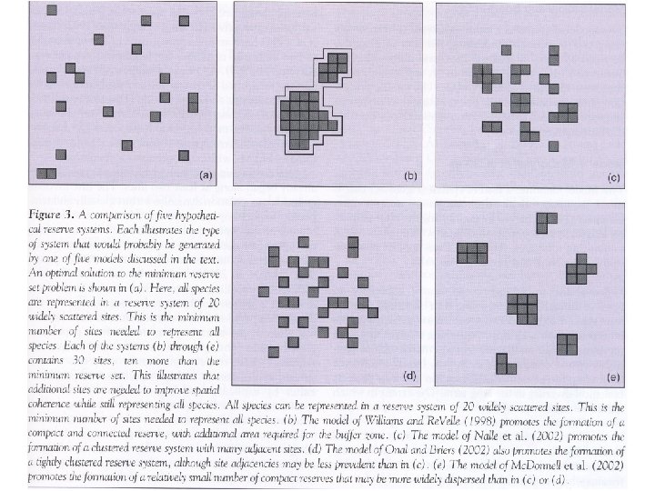A Synthesis of Modern Reserve Design Models: A number of reserve design approaches were summarized by Williams et al. (2004) based upon different objectives. These 4 approaches can be shown graphically (2 slides on) and described: 1) Identify a reserve core that contains all species, then add buffer around it, minimizing total cost of land to acquire; may promote connectivity and compactness of the reserve (image b in figure). 2) Highly connected and tightly clustered set of minireserves; summed distances between pairs is minimized and connectivity achieved by selecting adjacent pairs of cells (image c in figure).