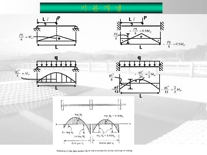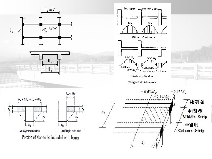 2) Distribution for Total Static Moment MO Interior span : MO + M= 0. 35 MO Mmi = 0. 40(0. 35 MO ) +M - M = 0. 65 MO Mco = 0. 60(0. 35 MO ) Mbe End span: MO Msl Mmi= 0. 25(0. 65 MO ) Mbe M co= 0. 75(0. 65 MO ) Msl Mco Mbe -M Mmi Msl Mmi : moment for middle strip, Mco : moment for column strip Mco Mbe Mmi Msl