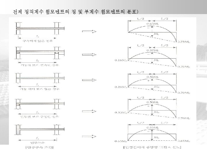 Distribution of Column-strip moment Mcolumn = Mbeam + Mslab = Mcolumn - Mbeam 중간대의 계수모멘트 Mmiddle = M - Mcolumn