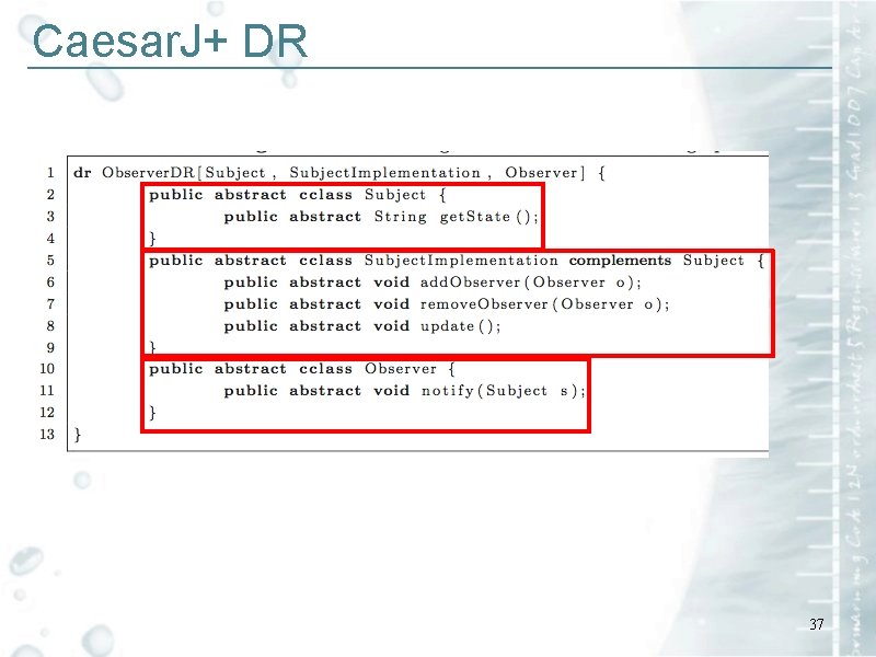 Observer Design Pattern ____________________________ R 1 – Two abstractions (roles) on the aspects: Subject and Observer R 3 – Aspect implementation separated from binding • Subject implementation – add. Observer, remove. Observer, update; Binding – get. State • Observer Binding - notify 36
