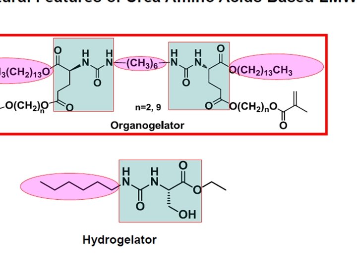 Low Molecular Weight Gelators (LMWGs) • A class of small molecules that can form gels in organic solvents or water, MW typically <1000. • The driving forces are non-covalent forces such as hydrogen bonding, - stacking and van der Waals interactions. • Preparations: dissolve compound (gelator) in a solvent, heat and/or sonicate to solution, leave at rt for 15 minutes.