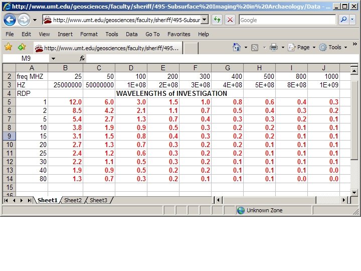 Wavelength = velocity / frequency Unfortunately, Earth is an efficient absorber of high frequency electromagnetic waves. Higher frequencies yield greater resolution but less depth penetration. Assuming ‘normal’ geologic materials: For depths 0. 3 < d < 2 meters antennas of 400 -500 MHz usually work well For depths 1 < d < 10 meters antennas of 200 -300 MHz work well. Spectrum returned from our 500 MHz antenna
