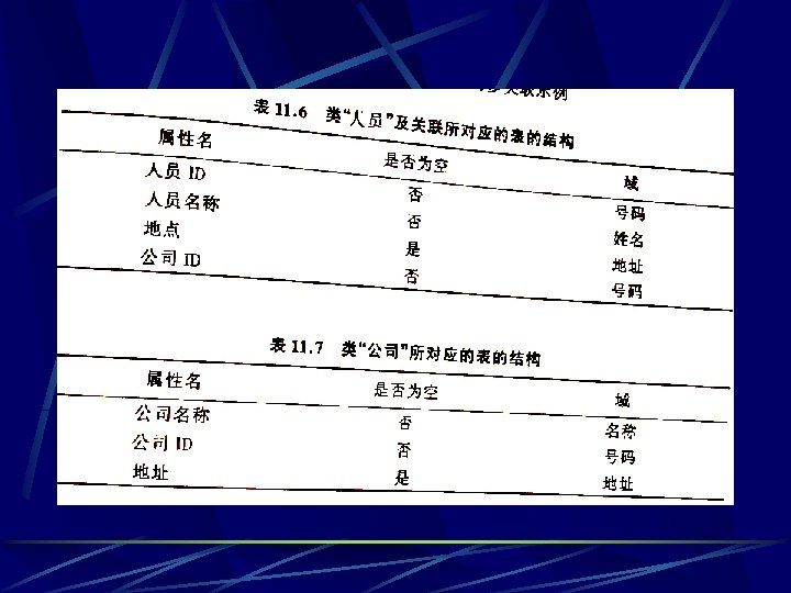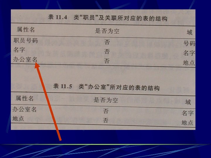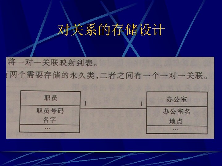 the Representing Object Relationships as Tables one-to-one associations Place an OID foreign key in one or both tables representing the objects in relationship. l Or, create an associative table that records the OIDs of each object in relationship. l
