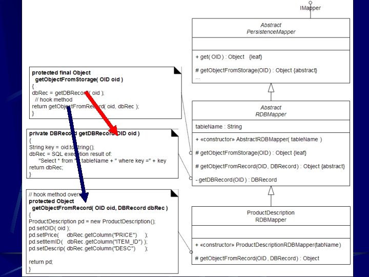 class Product. Specification. RDBMapper extends …{ // hook method override protected Object get. Object. From. Storage( OID oid ) { String key = oid. to. String(); db. Rec = SQL execution result of: "Select * from PROD_SPEC where key =" + key Product. Specification ps = new Product. Specification(); ps. set. OID( oid ); ps. set. Price( db. Rec. get. Column("PRICE") ); ps. set. Item. ID( db. Rec. get. Column("ITEM_ID") ); ps. set. Descrip( db. Rec. get. Column("DESC") ); return ps; } }
