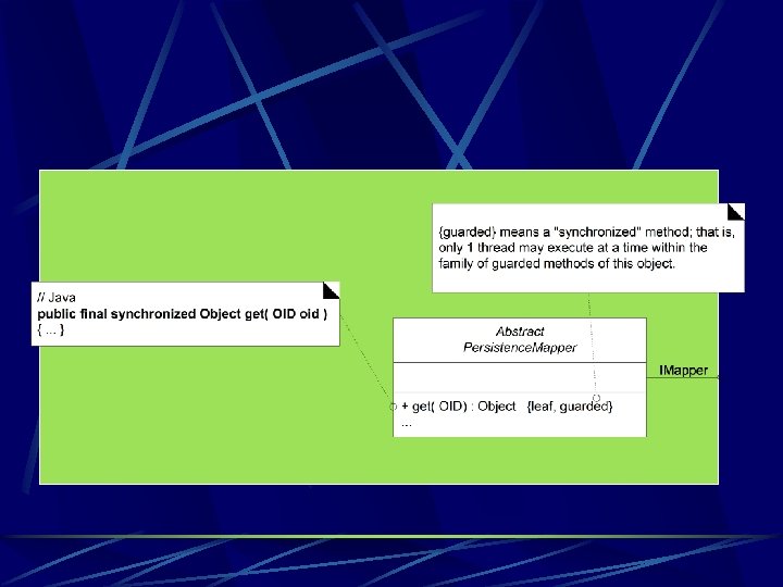 UML notation : This is a qualified assocation . It means : 1. There is a 1 -M association from Persistence. Facade to IMapper objects. 2. With a key of type Class , an IMapper is found (e. g. , via a Hash. Map lookup ) 1 Persistence. Facade «interface» IMapper 1 get. Instance Class () : Persistence. Facade get ( OID , Class ) : Object put ( OID , Object ). . . note that the Class as a parameter is no longer needed in this version of get , as the class is "hardwired " for a particular persistent type get (OID ) : Object put ( OID , Object ). . . Product. Specification RDBMapper Product. Specification Flat. File. Mapper Manufacturer RDBMapper . . get ( OID ) : Object put ( OID , Object ). . . each mapper gets and puts objects in its own unique way depending on the kind of data store and format ,