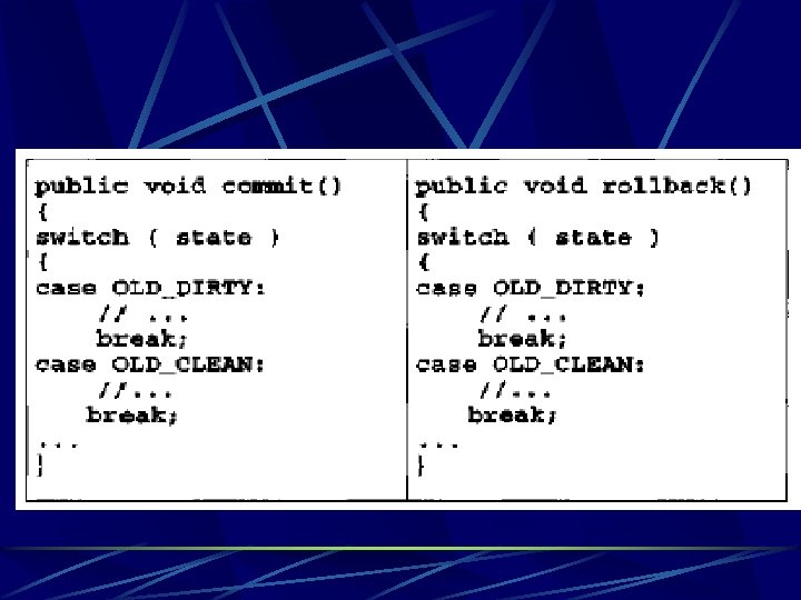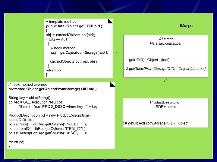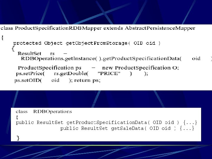 class RDBOperations { public Result. Set get. Product. Description. Data( OID oid ) {. . . } public Result. Set get. Sale. Data( OID oid ) {. . . } class Product. Description. RDBMapper extends Abstract. Persistence. Mapper{ protected Object get. Object. From. Storage( OID oid ) { Result. Set rs = RDBOperations. get. Instance(). get. Product. Description. Data( oid ); Product. Description ps = new Product. Description(); ps. set. Price( rs. get. Double( "PRICE" ) ); ps. set. OID( oid ); return ps; }