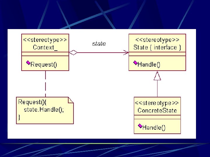 Go. F State pattern Context/Problem An object's behavior is dependent on its state, and its methods contain case logic reflecting conditional statedependent actions. Is there an alternative to conditional logic? Solution Create state classes for each state, implementing a common interface. Delegate state-dependent operations from the context object to its current state object. Ensure the context object always points to a state object reflecting its current state.