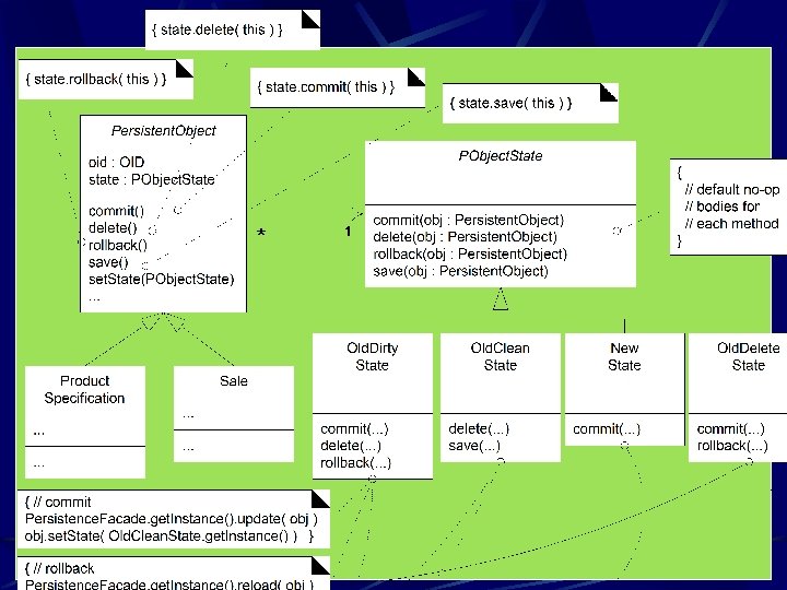 { sort() for each ICommand cmd. execute() } Transaction commands : List commit() add. Delete(obj: Persistent. Object ) add. Insert( obj: Persistent. Object ) add. Update( obj: Persistent. Object ) sort(). . . use Sort. Strategy objects to allow different sort algorithms to order the Commands «interface» ICommand execute( ) undo() DBCommand Persistent. Object object : Persistent. Object commands. add( new DBUpdate. Command (obj) ); perhaps simply object. commit() but each Command can perform its own unique actions 1. . * undo is a no -op fo this example , but more complex solution adds a polymorphic undo to each subclass which uniquely knows how to und an operation DBUpdate. Command execute() {abstract} undo() {leaf} DBInsert. Command execute() 1 commit(). . . DBDelete. Command execute()