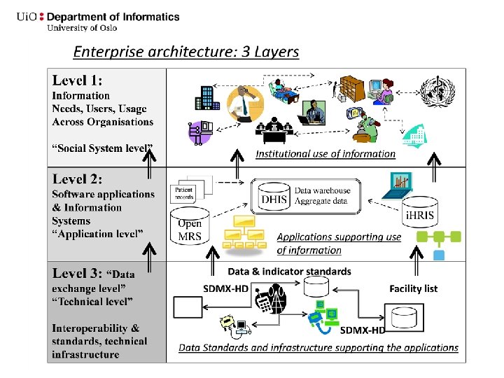 Horizontal integration: Information from across sectors & Organisational /political health programs available at “one point” level of integration (information needs & usage) Software applications & Information Systems Vertical Integration: “Seamless” flow of information from peripheral to central levels, from patient encounters in clinics to national M&E Horizontal integration: Data warehouse, such as DHIS, integrating & managing data from different health programs and sectors Vertical Integration: Extracting aggregate data from Human Resource system, and patient record systems into one data warehouse (e. g. DHIS 2) Data exchange, interoperability & standardisation Horizontal integration: Shared data & indicator standards prerequisite for sharing data across health programs & sectors, whether from paper or computer sources. SDMX-HD data exchange format enable transfer of indicator definitions and data Vertical Integration: Shared data standards also prerequisite for aggregating from individual human resource records in i. HRIS to data according to standard loaded in DHIS using SDMX-HD
