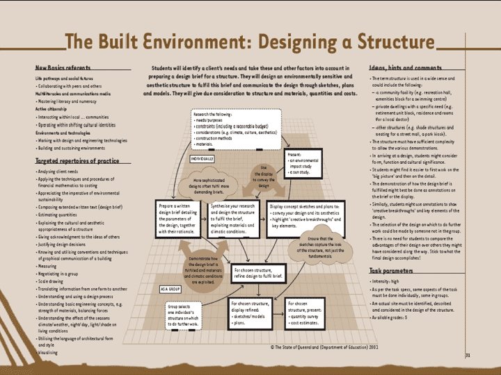 Extreme examples NSW § Examination § Physics § Year 12 (est. 7 min) § External assessment § Higher Sch Certificate § Fulfils design criteria § Meets depth definition § Triangle works QLD § Student task § Multi-disciplinary § Year 9 (3 yr) § Internal assessment § New Basics Report § Fulfils design criteria § Meets depth definition § Triangle works