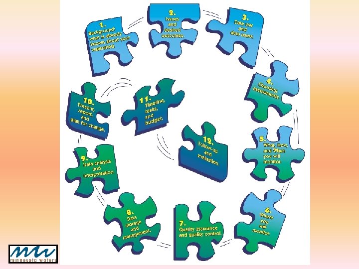 What is a Monitoring Plan? The Monitoring Plan is a sequence of strategic choices that focus decisions to meet goals and capabilities of the group. • Prevents waste of time and money on monitoring that is not valuable for your group. • Allows you to select monitoring strategy to address issues important to you and your community. • Helps you make sense of data by preparing you to turn it into useful information. • Minimizes impact of changing personnel