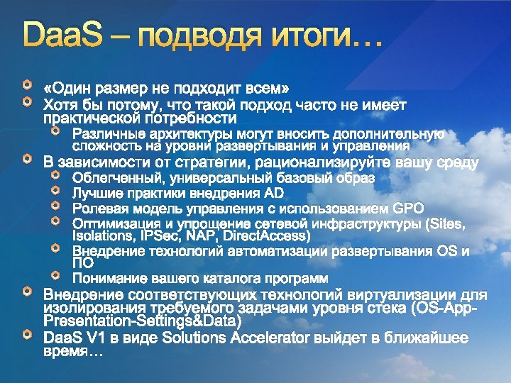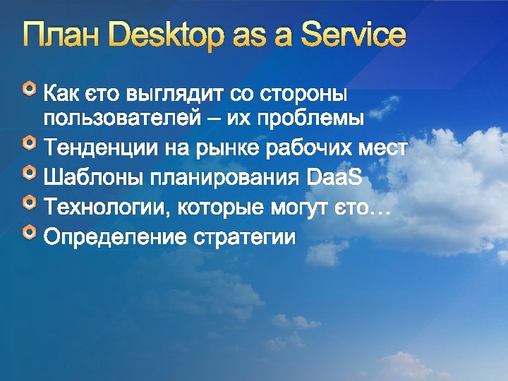 Предпосылки к Desktop as a Service Daa. S это не только, и не сколько VDI – это не Daa. S … это использование соответствующих методов для изоляции, виртуализации, доставки и управления, чтобы соответствовать требованиям Предпосылки… “A user should receive the right desktop and associated applications, at the right time on the right device. The desktop should not be associated with the device – the device can be thought of as a portal which surfaces the users applications, data, user state and authorisation and access”