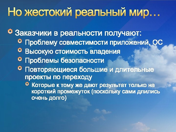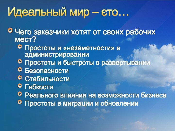 Выгоды и их качественные показатели • • • B 1: Applications/Data follows user Core Apps available in x mins Productivity Apps available in x mins Heavy weights Apps (Design tools) – x hr B 2: Restrict elevated security privilege Max % of devices with elevated rights • • • B 3: Simplified App Provisioning max x mins delivery Consumer like experience Apps delivered within x x mins depending on complexity) Ability to schedule deployment B 4: Maintain Reliability x mins lost user time/year B 5: Improve Performance Desktop start-up time – x mins • Desktop shutdown – x mins • Consistency in reboot after patching • • B 6: Improve End User training Target CSAT measure (TBD) • • • B 7: Keep IT Current Deploy Applications/Operating System x months after accreditation Refresh HW every x years B 8: Reduce spend on Software Licensing Metrics (TBD) Better exploitation of Microsoft Enterprise Agreement Identify areas of centralised procurement of licences B 9: Faster turnaround for new Application delivery • Certify & Deploy new Applications in x months B 10: Minimise End User Disruption • End user disruption to Operation System upgrade – x mins (Desktop), x hours (laptop) • Applications Upgrade (e. g. Office) – x mins B 11: Reduced cost for providing desktop service • Cost/unit/year metric (TBD) Цели Движители O 1: Work Anywhere D 1: Ability to Work on customer sites O 2: Work Offline D 2: Ability to collaborate with key partners Внешние O 3: Simplify O 4: Improve Reliability O 5: Improve Performance O 6: Effective End user training O 7: Flexible IT provisioning O 8: Improve License Management O 9: User focussed rather than device focussed D 3: Security Accreditation D 4: Globalization Внутренние D 5: Dynamic Demand (Redundancies/ Recruitment) D 6: Expectations from gen next D 7: Agility (IT reacting to biz requirements) D 8: Obsolescence O 10: Respond to Biz change quickly O 11: Continuous & Manageable Change O 12: Reduce cost/unit for desktop D 9: Lower cost/unit D 10: Minimise Disruption D 11: User Choice/ empowerment D 12: Exploiting IT assets