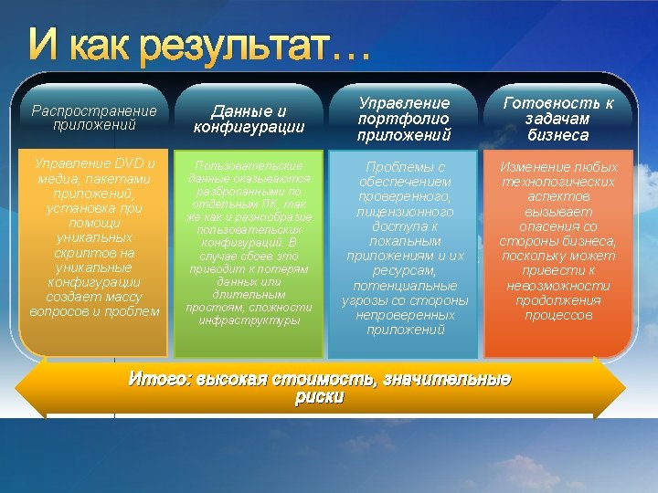 Развертывание вашей архитектуры Mobile Rich Client Contract/ Offshore Image Management Patch Management TS Remote Client Office HW/SW Inventory OS or App Deployment Application Lifecycle Well Managed Desktop Anywhere -on non company PC Virtualized Applications Task VDI or Blade PC