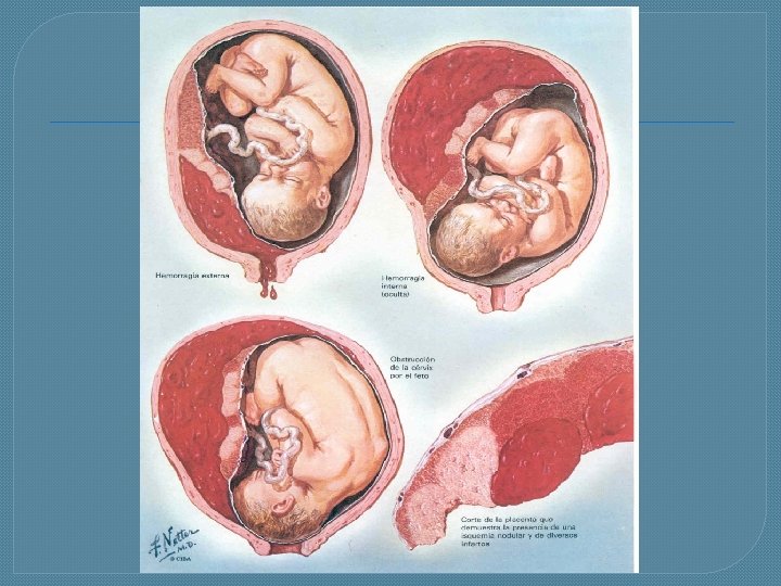 Fisiopatología. �Puede ser un hallazgo posterior al alumbramiento. �En caso que el hematoma diseque hasta alcanzar el borde placentario, puede haber exteriorización del sangrado. • A la inversa, si el hematoma no logra disecar los márgenes, se abre camino hacia la cavidad amniótica o el polo cefálico fetal comprime el segmento, puede presentarse como “hemorragia oculta”.