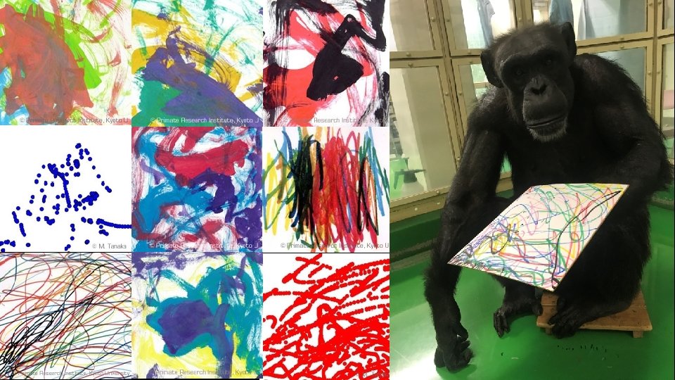 Dessins d’orang-outans • Au parc de Tama, Tokyo, Japon • Des centaines de dessins • 4 individus avec différentes capacités • Connaissance de la date du dessin, du statut reproducteur, de la naissance des bébés, etc.