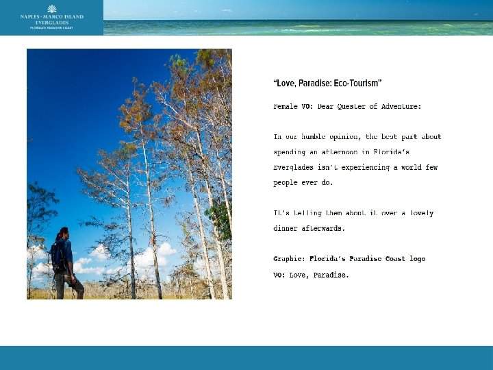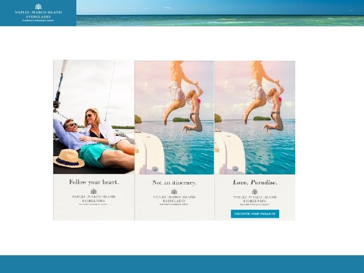 Creative Approaches ● Create a collection of ads that speak to a variety of interests (i. e. , beach, dining, shopping, golf, fishing, diving, eco-adventure, etc. ) that can be hyper-targeted to our customer profile ● Create a personalized conversation with each potential or repeat customer ● Utilize content of varying lengths to engage consumers to discover our destination on their terms ● Develop content that can be used across all platforms, including web, social media, and mobile ● Create new photo and video assets that can be utilized in every medium, at every stage of the customer’s journey to a buying decision