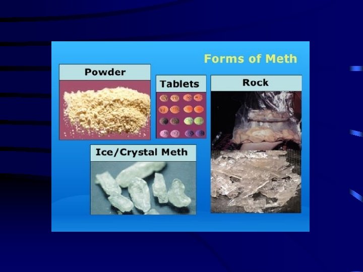 Forms In tablet or powder form or in a waxy form known as “base”, “paste”, “wax” or “point”. “Crystal” or “ice” (d- MA hydrochloride) is a more potent form of MA that consists of a recrystallized powder (dissolve and crystalize from solution, in order to purify).