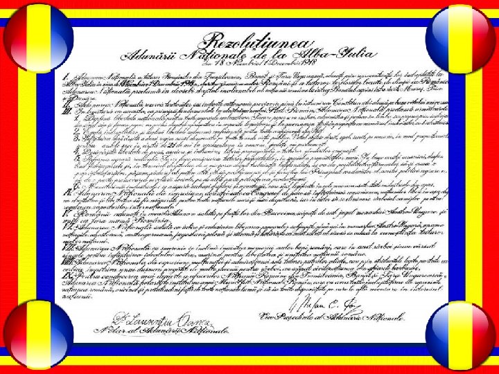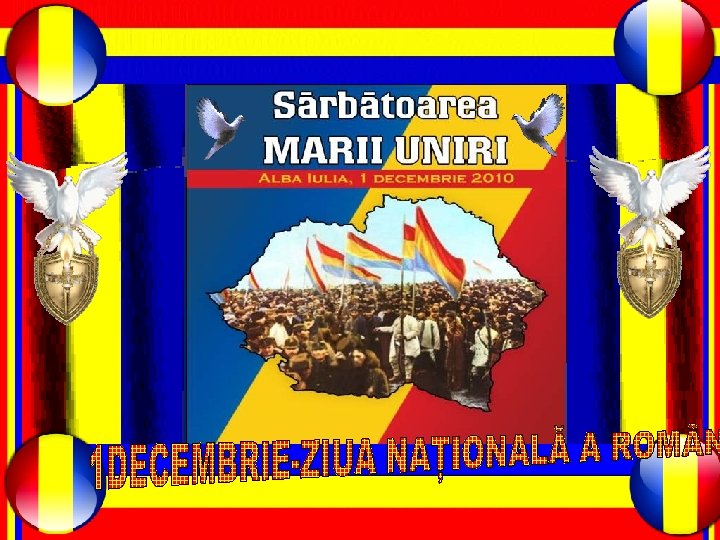 LA MULȚI ANI ROM NI! LA MULȚI ANI ROM NIA! “ 1 Decembrie 1918 este fapta istorica a intregii națiuni române” Dragii mei, trebuie să rămânem datori față de inaintașii noștrii cărora le datorăm cel mai scump lucru din viața unui neam : libertatea naţională. Prin urmare chiar dacă suntem foarte ocupați nu trebuie să neglijăm istoria noastră națională, trebuie să citim în cărțile de istorie despre curajul pe care l-au avut românii dinaintea noastră, să ne întrebăm dacă noi mai avem aceea forță și să nu uităm să simțim obiceiurile și tradiția noastră românească.