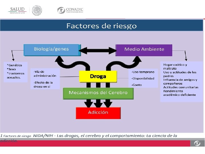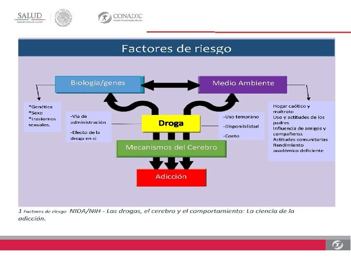 Factores de riesgo Los factores de riesgo pueden aumentar las posibilidades de que una persona abuse de las drogas mientras que los factores de protección pueden disminuir este riesgo. • factor de riesgo : atributo y/o característica individual, condición situacional y/o contexto ambiental que incrementa la probabilidad del uso y/o abuso de drogas (inicio) • factor de protección: atributo o característica individual, condición situacional y/o contexto ambiental que inhibe, reduce o atenúa la probabilidad de uso y/o abuso de drogas