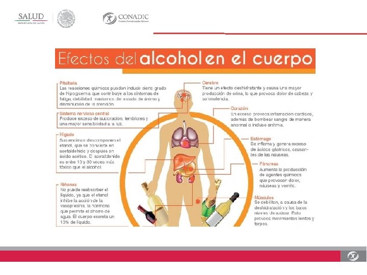 Efectos en el organismo Agudos: • • • Somnolencia Mala coordinación Irritación del estómago Afectación de la percepción de los sentidos Confusión Trastornos neuropsiquiátricos: Wernike. Korsakoff Cáncer: de colon, recto, mama, laringe, hígado, esófago, cavidad oral y faringe. Síndrome de alcoholismo fetal y pretérmino Discapacidad intelectual y malformaciones Lesiones intencionales, violencia, suicidio. Crónicos: • Enfermedades cardiovasculares: elevación de la presión arterial, derrames cerebrales, hemorragias • Enfermedades del hígado • Cirrosis