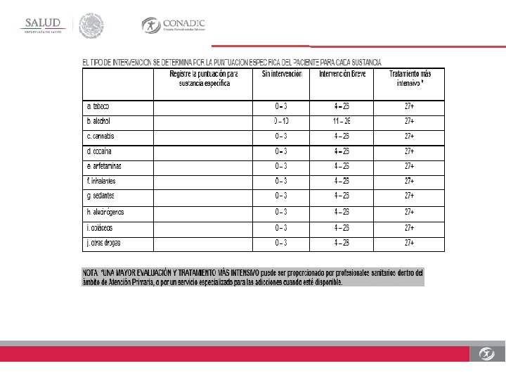 Instrumento de tamizaje ü Cuestionario de dependencia al tabaco, FARGESTRÖM ü Cuestionario para la Identificación de los trastornos por el uso de alcohol, AUDIT ü Cuestionario de Tamizaje para los problemas de los Adolescentes, POSIT ü Cuestionario de detección del consumo de Alcohol, Tabaco y sustancias, ASSIST.