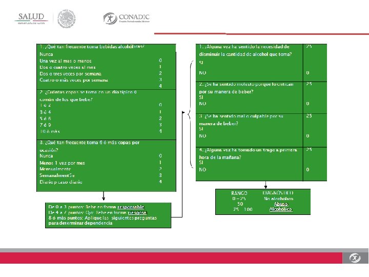 Indaga: Si necesita diagnosticar problemas de consumo de drogas aplique el siguiente cuestionario y sume los puntos. ¿Qué hacer dependiendo del nivel del problema? Si suma de 0 a 3 puntos se considera que bebe en forma responsable. *Le sugerimos que le haga ver que su forma de beber es la adecuada y que no aumente su consumo. Si suma de 4 a 7 puntos se considera que bebe de forma riesgosa. *Le sugerimos que haga una sesión de Consejo Breve con el metodo IDEAS y/o canalice a intervención breve para bebedores problema a un centro de la Red “Uneme Capa” o a otra institución especializada. Brinde apoyo a la familia. *La meta sugerida es moderación o abstinencia. Si suma de 8 o más puntos se aplican las siguientes 4 preguntas. Si en ellas suma 50 puntos se considera que haga una sesión de Consejo Breve para bebedores problema a un centro de la Red “ Uneme Capa” o a otra Institución especializada. Brinde apoyo a la familia. *La meta sugerida es la moderación o abstinencia. Si en las cuatro preguntas suma de 75 a 100 puntos se considera que es dependiente al alcohol. *Le sugerimos canalizar a terapia breve para bebedores a un Centro de la Red “UNEME - CAPA” o a otra institución especializada. Brinde apoyo a la familia. La meta sugerida es la abstinencia.