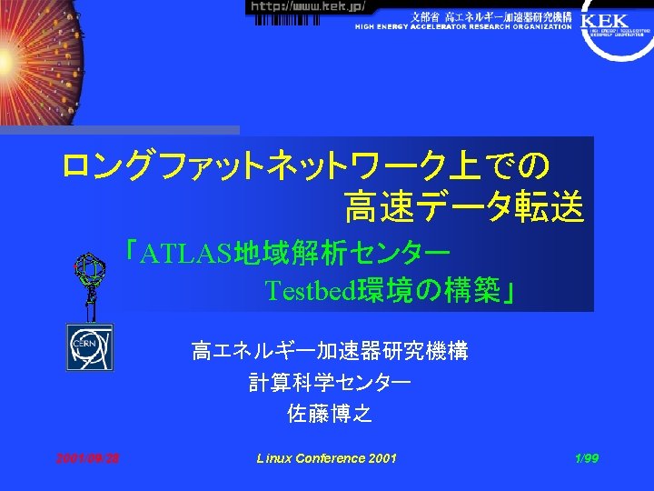 次期陽子陽子衝突型実験 Detector for LHCb experiment 取得データ量 100 MB/sec ↓ 1 PB/year これを34ヶ国の 1850人が利用する (ATLASの場合) Detector for ALICE experiment 2001/09/28 Linux Conference 2001 4