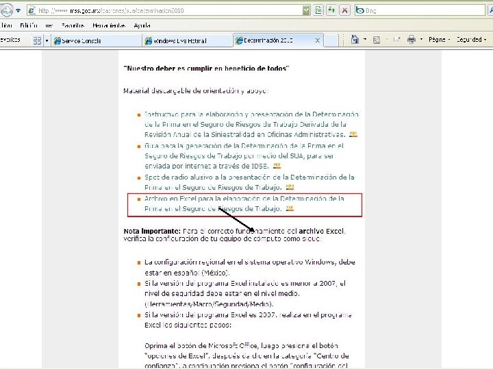 “RECOMENDACIONES” • OPCION PRINCIPAL PARA PRESENTAR LA DETERMINACION DE PRIMA: POR INTERNET A TRAVES DEL SUA. • EN CASO DE EXISTIR ERRORES INVOLUNTARIOS EN LOS DATOS POR IDSE, REALIZARLO EN ARCHIVO EXCEL PAGINA DEL IMSS. • EN CASO DE HACERLO A MAQUINA DE ESCRIBIR (SE REQUIERE DATOS LEGIBLES Y FIRMADO POR EL PATRON O REPRESENTANTE LEGAL DE LA EMPRESA)