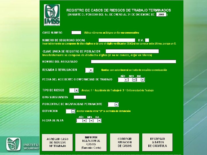 RELACION DE CASOS DE RIESGOS DE TRABAJO TERMINADOS (DURANTE REGISTRO PATRONAL 00000 00 NOMBRE O EL PERIODO DEL 1 o. DE ENERO AL 31 DE DICIEMBRE DEL ) D. V. 0 RAZON SOCI AL: 0 DOMICILIO Y TEL. NUMERO DE SEGURIDAD SOCIAL 00 0000 NOMBRE DEL ASEGURADO 10 POSICIONES LAS NECESARIAS RECAIDA O REVALUACION ( ) 1 POSICION FECHA DEL ACCIDENTE O ENFERMEDAD DE TRABAJO (AÑO MES DIA) AAAA MM DD 8 POSICIONES TIPO DE RIESGO 1ó 3 1 POSICION DIAS SUBSIDIADOS 000 3 POSICIONES