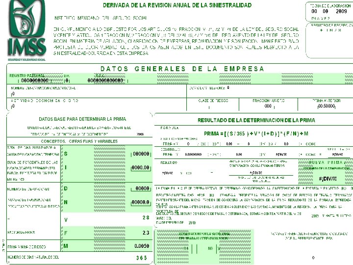 Empresa de clase I y que en el 2009 cotizó con la prima del 0. 50000 % S= 0 I= 0. 00 D= 0 N= 1. 0 F= 2. 3 M= 0. 0050 DESPEJE DE LA FORMULA PRIMA= (0/365) + 28 * (0. 00 + 0) * ( 2. 3/1. 0) + 0. 0050 PRIMA =[(0. 0000) + 28 * (0. 0)] * (2. 3/1. 0) +0. 0050 =[0. 0000 + 0. 00] * (2. 3/1. 0) + 0. 0050