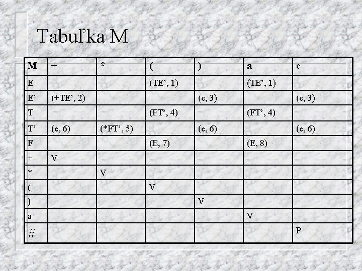 Príklad n 1. 2. 3. 4. 5. 6. 7. 8. Vrátime sa zase ku gramatike, ktorú sme transformovali na LL(1) E T E’ E’ + T E’ E’ e T F T’ T’ * F T’ T’ e F (E) F a