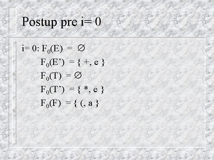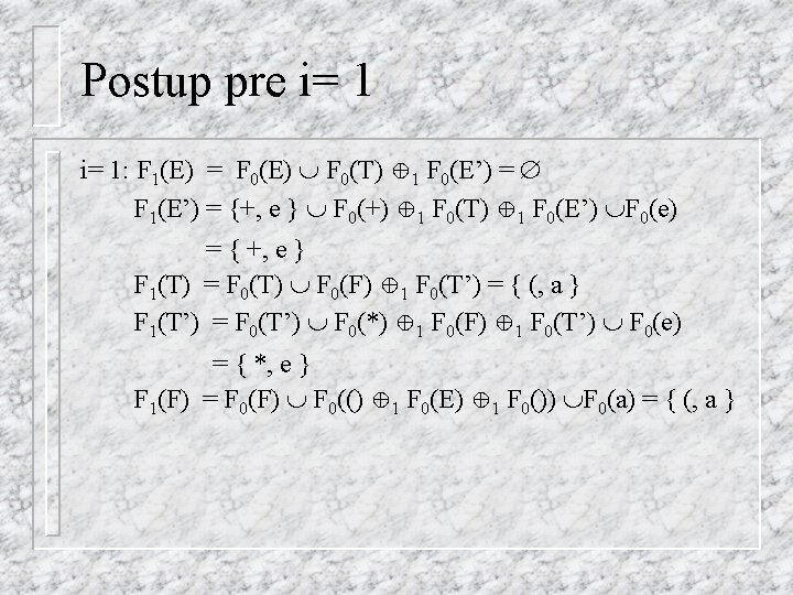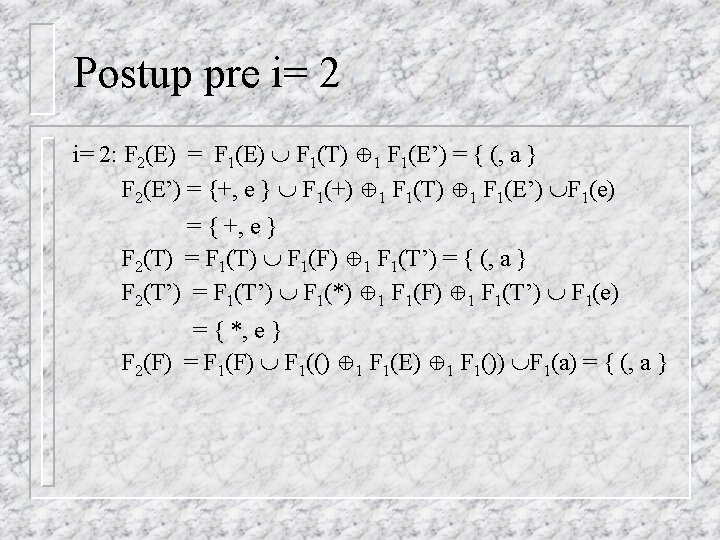 Postup pre i= 3 F 3(X) = F 2(X) preto FIRST 1(E) = { (, a } FIRST 1(E’) = { +, e } FIRST 1(T) = { (, a } FIRST 1(T’) = { *, e } FIRST 1(F) = { (, a }