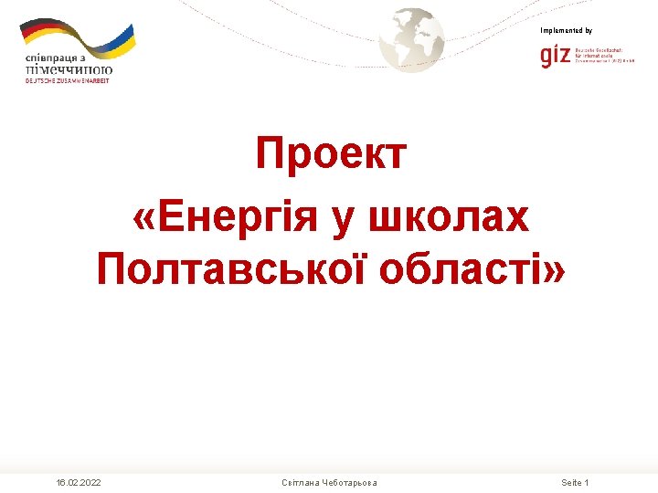 Implemented by As a federal enterprise, GIZ supports the German Government in achieving its objectives in the field of international cooperation for sustainable development. Published by Deutsche Gesellschaft für Internationale Zusammenarbeit (GIZ) Gmb. H Responsible Крістіана Хагенедер Author(s) Світлана Чеботарьова Registered offices, Bonn and Eschborn, Germany Проект "Енергоефективність у громадах" вул. Хрещатик, 15, оф. 69 Київ 01001 In cooperation with T +380 44 279 1726 F +380 44 279 1729 E I swetlana. tschebotarjowa@giz. de www. eeib. org. ua 16. 02. 2022 XXX Seite 11