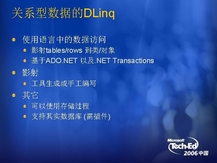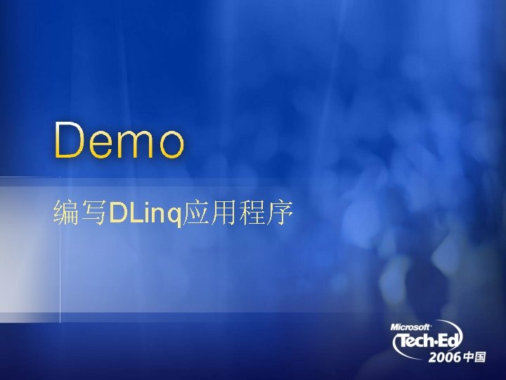 关系型数据的DLinq 使用DLing访问数据 Public Class Customer … Classes describe data Public Class Northwind Inherits Data. Context Tables are like collections Public Property Customers As Table(Of Customer) … Strongly typed End Class connection Dim db As New Northwind(…) Dim contacts = _ Integrated From c in db. Customers _ query syntax Where c. City = "London" Select c. Name, c. Phone Strongly typed results