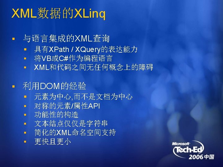 在Visual Basic中集成XML 利用XLinq在VB中进行XML编程 Infers XLinq XElement Dim contacts = _ <contacts> No conceptual <%= _ barrier From c In customers _ Where c. Country = "USA" _ Select <contact> <name> <%= c. Company. Name %></name> <phone> <%= c. Phone %></phone> </contact> _ %> </contacts> Expression holes for computed values