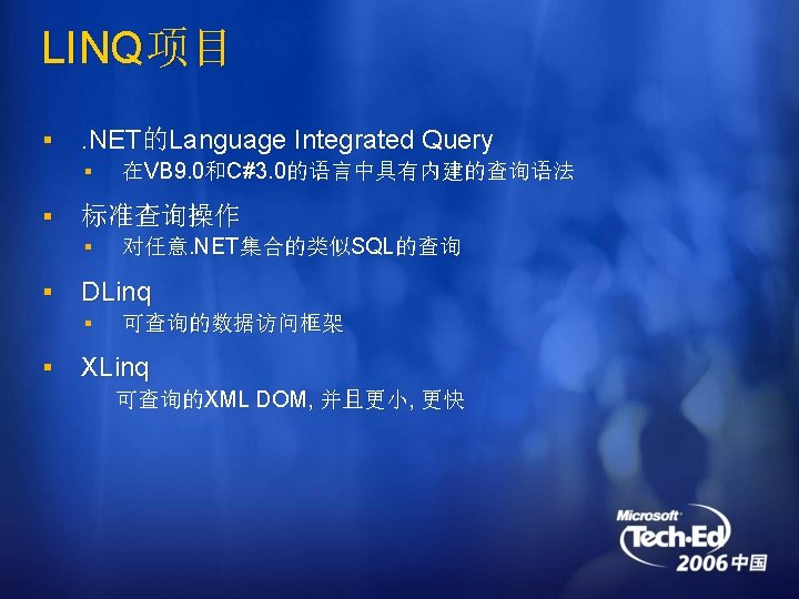 LINQ项目 VB C# Others… . NET Language Integrated Query Standard Query Operators DLinq (ADO. NET) XLinq (System. XML) <book> <title/> <author/> <year/> <price/> </book> Objects SQL XML