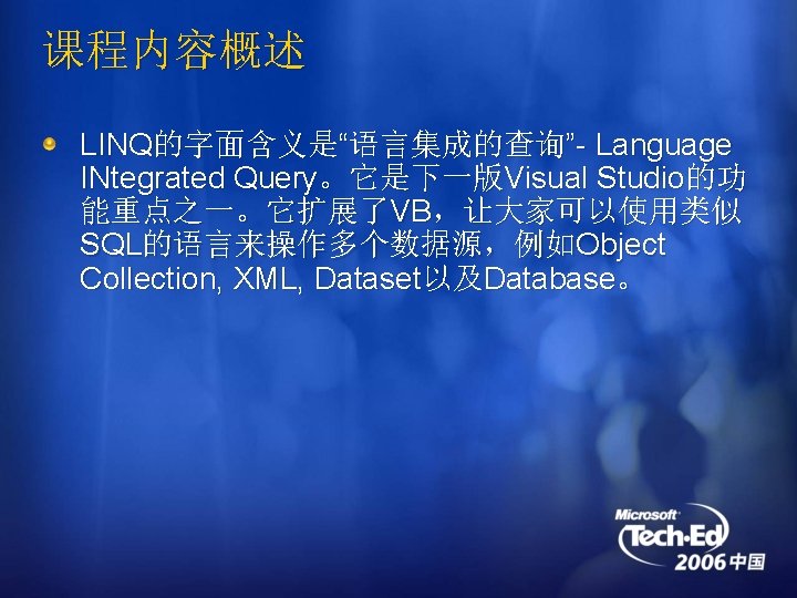总结 § Language Integrated Query Language 的优点 § 对于对象数据, 关系型数据和XML数据的统一查询 § 查询的类型 § 在VB和C#中的类似SQL和XQuery的查询 § 仅支持. NET平台 § 更多信息 § 主页: http: //msdn. microsoft. com/netframework/future/linq/ § 可下载Customer Tech Previews版本! § Contact: Juliapa@microsoft. com 我们需要您的反馈意见