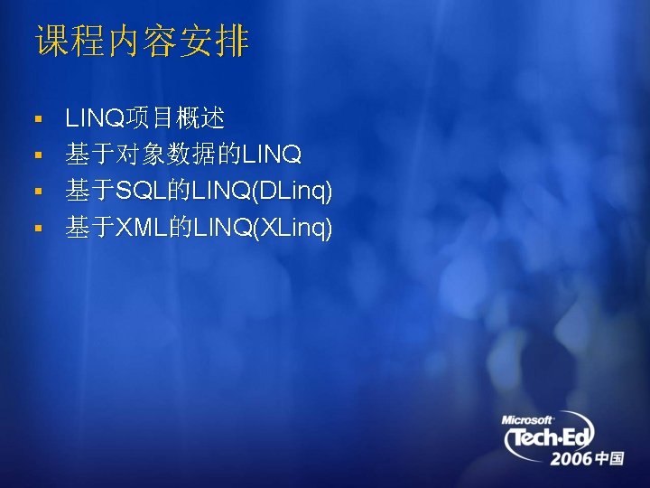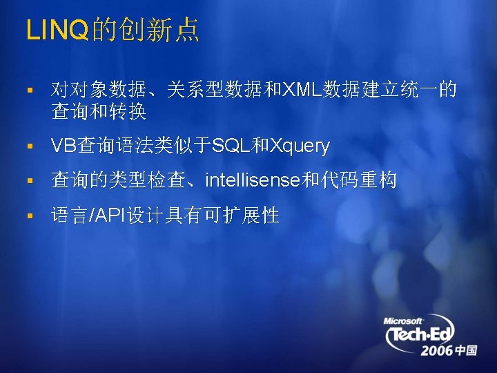 XML数据的XLinq 使用XLinq进行编程 Dim contacts As New XElement("contacts", _ From c in customers _ Where c. Country = "USA“ _ Select New XElement("contact", _ new XElement("name", c. Company. Name), _ new XElement("phone", c. Phone) _ ) ) Declarative model Element centric Integrated queries Smaller and faster