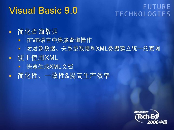 XML Member Binding XML成员绑定 Late binding covers all XML axes 延后绑定所有的 XML axes Dim cosmos As XElement = Get. Current. Link. Cosmos(). Root Dim ver As Double = CDbl(cosmos. Attribute("version")) Dim item As XElement = First(cosmos. Descendents("item")) Dim created As Date = CDate(item. Element("linkcreated“)) Attributes Descendents Dim cosmos As XElement = Get. Current. Link. Cosmos(). Root Elements Dim ver As Double = CDbl(cosmos. @version) Dim item As XElement = cosmos…<item>. Value Dim created As Date = CDate(item. <linkcreated>)