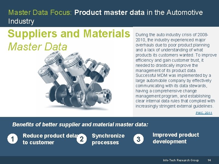 Master Data Focus: Product master data in the Automotive Industry Suppliers and Materials Master Data During the auto industry crisis of 20082010, the industry experienced major overhauls due to poor product planning and a lack of understanding of what products its customers wanted. To improve efficiency and gain customer trust, it needed to drastically improve the management of its product data. Successful MDM was implemented by a large automobile company by effectively communicating with its data stewards, having a comprehensive change management program, and establishing clear internal data rules that complied with increasingly stringent external guidelines. PWC, 2011 Benefits of better supplier and material master data: 1 Reduce product delays 2 to customer Synchronize processes 3 Improved product development Info-Tech Research Group 14