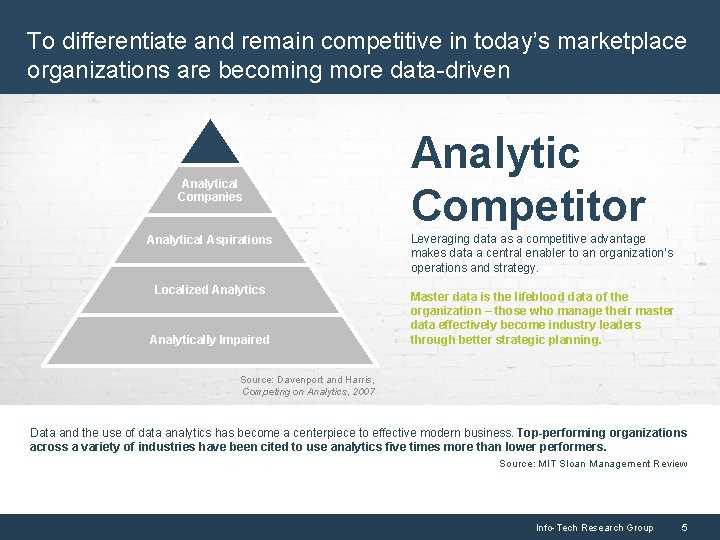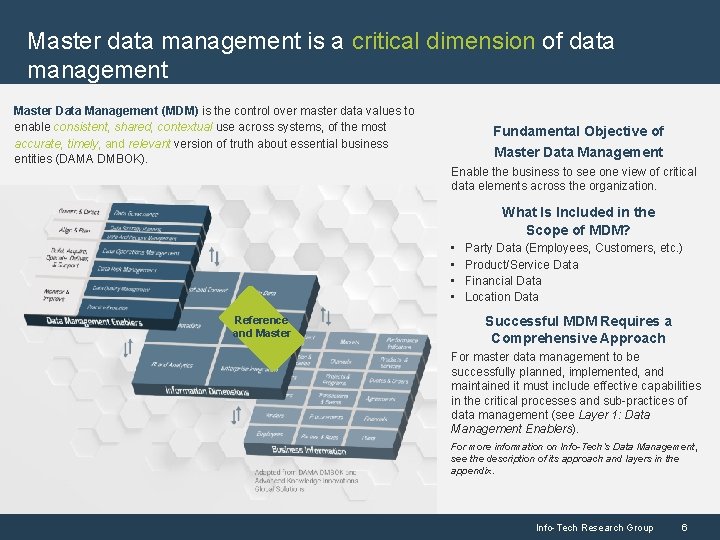 To differentiate and remain competitive in today’s marketplace organizations are becoming more data-driven Analytical Companies Analytical Aspirations Localized Analytics Analytically Impaired Analytic Competitor Leveraging data as a competitive advantage makes data a central enabler to an organization’s operations and strategy. Master data is the lifeblood data of the organization – those who manage their master data effectively become industry leaders through better strategic planning. Source: Davenport and Harris, Competing on Analytics, 2007 Data and the use of data analytics has become a centerpiece to effective modern business. Top-performing organizations across a variety of industries have been cited to use analytics five times more than lower performers. Source: MIT Sloan Management Review Info-Tech Research Group 5