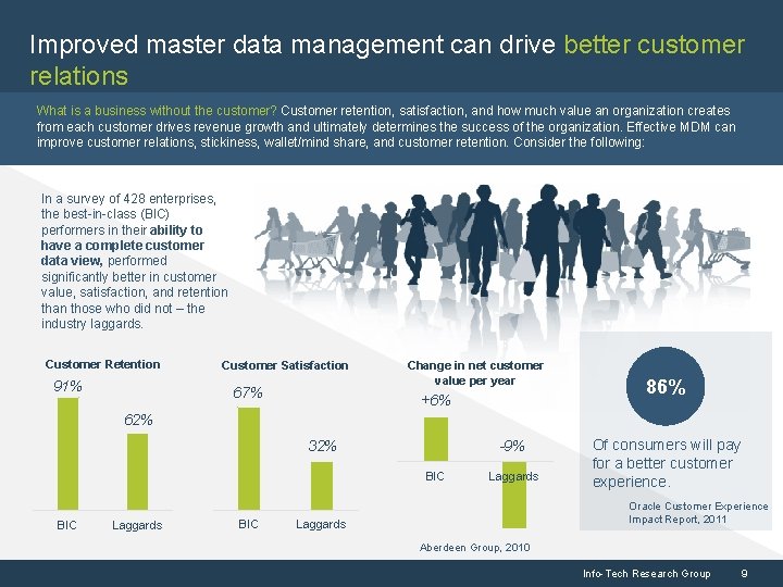 Master data drives practical insights that arise from key aspects of the business A Single Source of Truth Well-managed master data, the key dimension around which analytics are done, can provide a single, reliable, and precise view of the organization. Why Manage Master Data? 1 Customer Intimacy 2 Improve marketing and the customer experience by using the right data from the system of record to analyze complete customer views of transactions, sentiments, and interactions. 3 Risk Management Maintain more transparent and accurate records and ensure that appropriate rules are followed to support audit, compliance, regulatory, and legal requirements. Monitor data usage to avoid fraud. Innovation Leadership Gain insights on your products, services, usage trends, industry directions, and competitor results, and use these data artifacts to support decisions on innovations, new products, services, and pricing. 4 Operational Excellence Make sure the right solution is delivered rapidly and consistently to the right parties for the right price and cost structure. Automate processes by using the right data to drive process improvements. Info-Tech Research Group 8