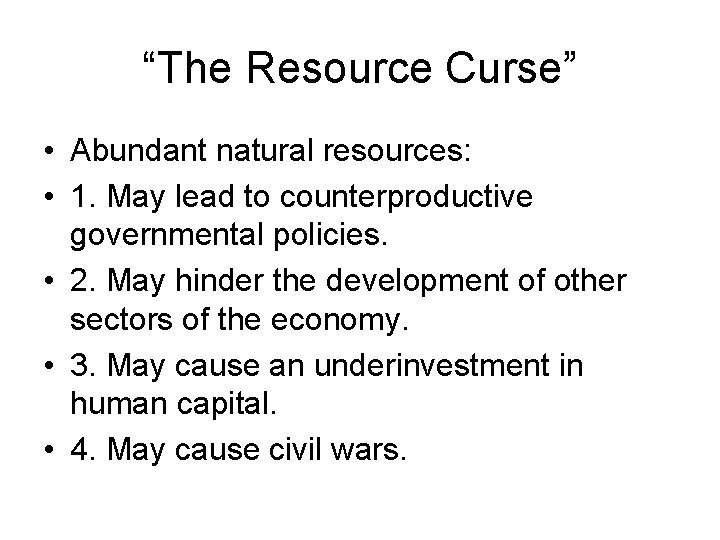 “The Resource Curse” • Abundant natural resources: • 1. May lead to counterproductive governmental policies. • 2. May hinder the development of other sectors of the economy. • 3. May cause an underinvestment in human capital. • 4. May cause civil wars.