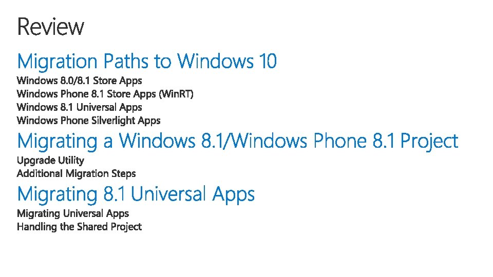 Port the UI Silverlight -> Windows XAML Rewrite code to target UWP APIs* Design UX for multiple form factors Windows Phone 7. 5/7. 8 Windows Phone 8. 0 Windows Phone 8. 1* *Silverlight on Windows Phone 8. 1 can be a mix of Silverlight and Win. RT APIs Windows 10